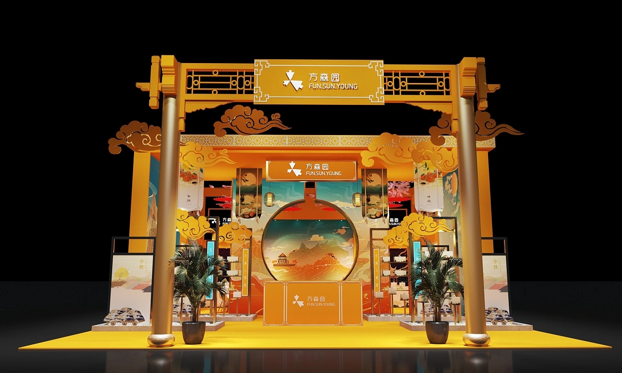 該展臺搭建面積為90平方米,整個展臺設計圍繞國風元素進行設計。該展臺結合了中秋的主題,在展臺設計搭建上采用金黃色作為主色調,展臺裝修設計了祥云、燈籠等傳統國風元素,整個展臺設計充滿金秋祥和如意、溫暖喜慶、高端大氣的展臺空間氛圍。